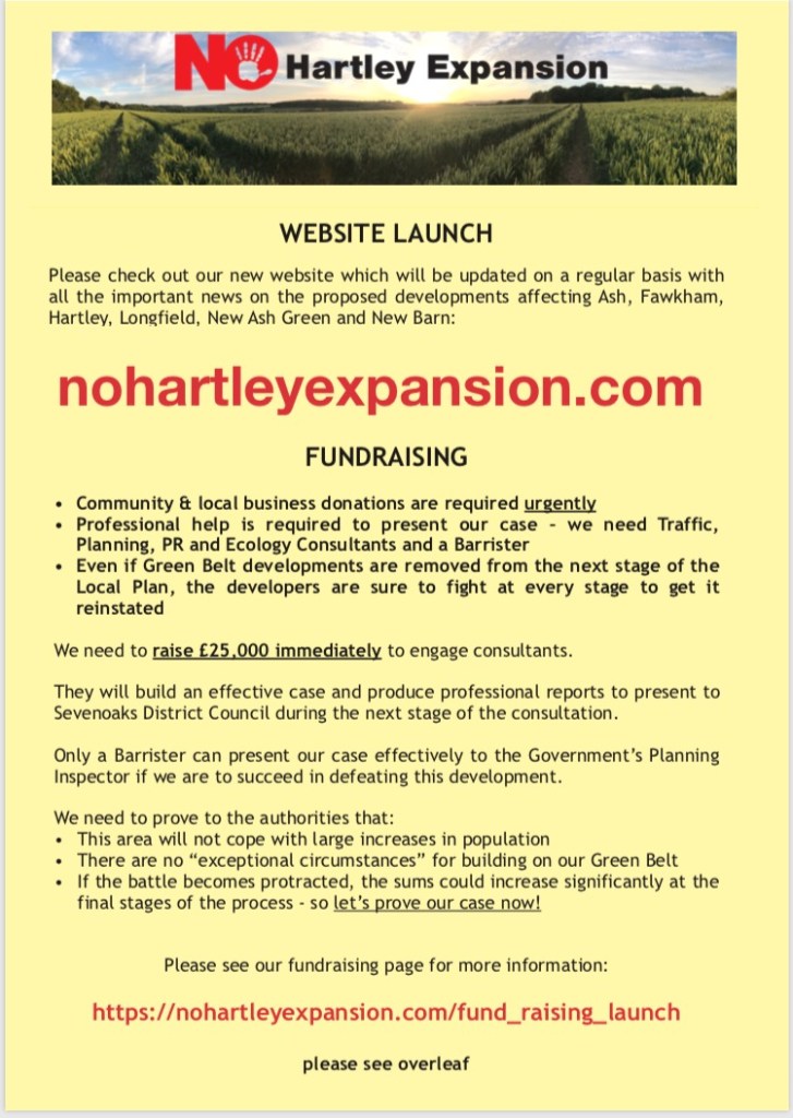 To achieve this aim we set up a Facebook page, organised the printing and distribution of 3 leaflet drops to all households in Hartley, Fawkham, New Ash Green and Longfield , organised and staffed 3 drop in clinics at the Hartley Country Club and of course put up a number of the now iconic yellow NO Hartley Expansion Banners across the 4 villages. So what next?